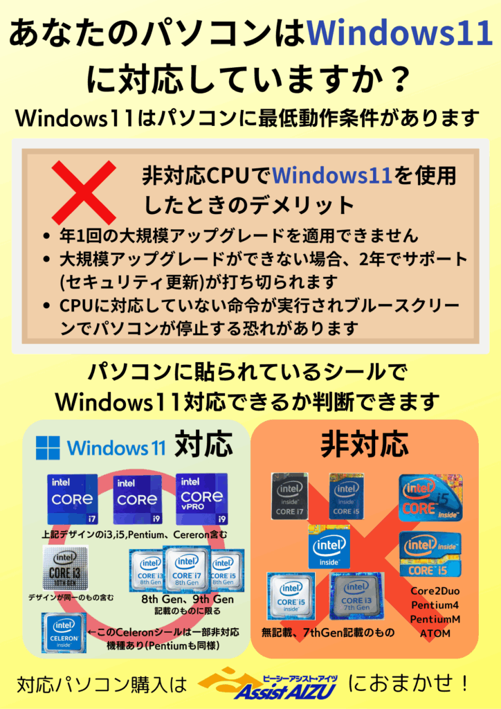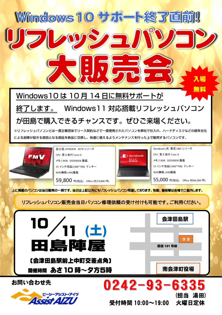 本年10月14日にWindows10のサポートが終了します。Windows11へ移行を考えている皆様。出張修理相談会&リフレッシュパソコン販売会では、格安のWindows11搭載中古パソコンを販売しております。在庫ある場合、当日お持ち帰り可能です。ぜひご来店ください。
